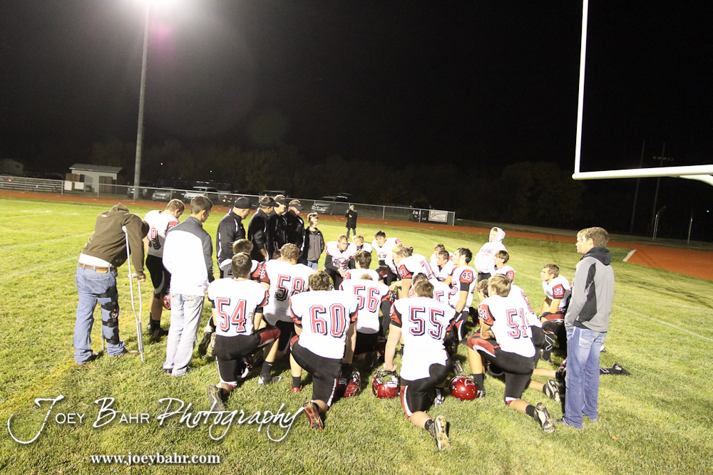 The Plainville Cardinal Coaches address their players after the Plainville versus LaCrosse KSHSAA Class 2-1A Regional Football Playoff game with LaCrosse winning 41 to 14 at Bill Schoenfelder Field in LaCrosse, Kansas on November 8, 2013. (Photo: Joey Bahr, www.joeybahr.com)