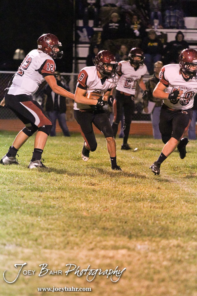 Plainville Cardinal Hadley Gillum (#12) hands the ball off to Trevor Desaire (#8) during the Plainville versus LaCrosse KSHSAA Class 2-1A Regional Football Playoff game with LaCrosse winning 41 to 14 at Bill Schoenfelder Field in LaCrosse, Kansas on November 8, 2013. (Photo: Joey Bahr, www.joeybahr.com)