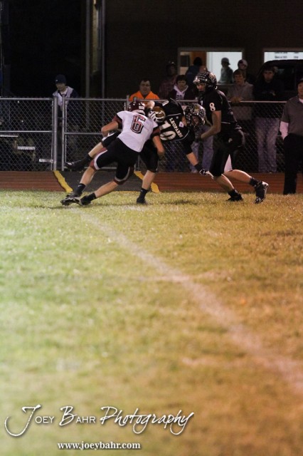 Plainville Cardinal Dylan Dohe (#6) tackles LaCrosse Leopard Andrew Jay (#10) during the Plainville versus LaCrosse KSHSAA Class 2-1A Regional Football Playoff game with LaCrosse winning 41 to 14 at Bill Schoenfelder Field in LaCrosse, Kansas on November 8, 2013. (Photo: Joey Bahr, www.joeybahr.com)