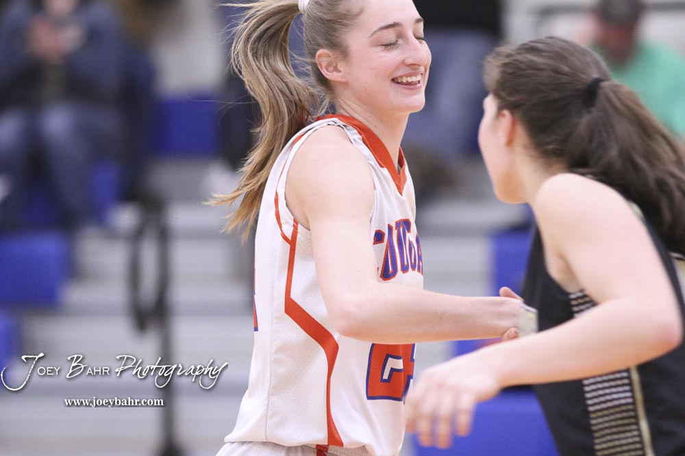 Otis-Bison Lady Cougar #24 Cristen Trapp shakes the hand of a LaCrosse Lady Leopard during player introductions. The Otis-Bison Lady Cougars defeated the LaCrosse Lady Leopards by a score of 43 to 19 in a game held at Otis-Bison High School in Otis, Kansas on February 17, 2020. (Photo: Joey Bahr, www.joeybahr.com)