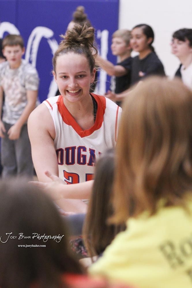 Otis-Bison Lady Cougar #22 Maddie Wiltse greets fellow students during player introductions. The Otis-Bison Lady Cougars defeated the LaCrosse Lady Leopards by a score of 43 to 19 in a game held at Otis-Bison High School in Otis, Kansas on February 17, 2020. (Photo: Joey Bahr, www.joeybahr.com)
