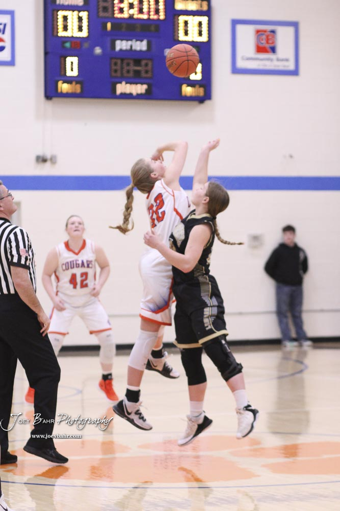Otis-Bison Lady Cougar #22 Maddie Wiltse and LaCrosse Lady Leopard #24 Brooke Herrman jump for the opening tipoff. The Otis-Bison Lady Cougars defeated the LaCrosse Lady Leopards by a score of 43 to 19 in a game held at Otis-Bison High School in Otis, Kansas on February 17, 2020. (Photo: Joey Bahr, www.joeybahr.com)
