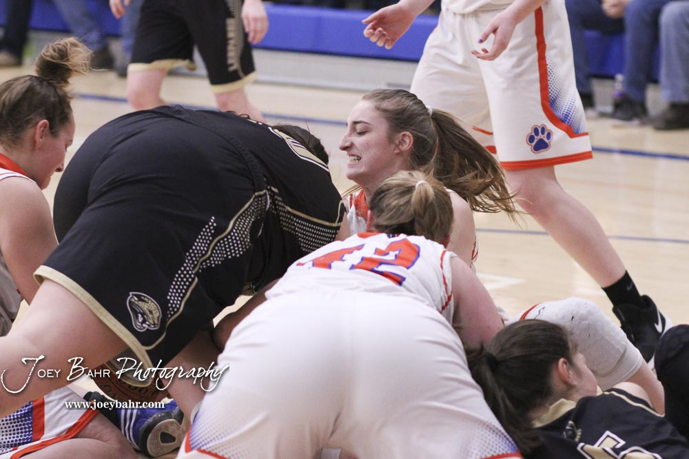 Otis-Bison Lady Cougar #24 Cristen Trapp tries to gain control of a loose ball in the middle of a pile of players. The Otis-Bison Lady Cougars defeated the LaCrosse Lady Leopards by a score of 43 to 19 in a game held at Otis-Bison High School in Otis, Kansas on February 17, 2020. (Photo: Joey Bahr, www.joeybahr.com)