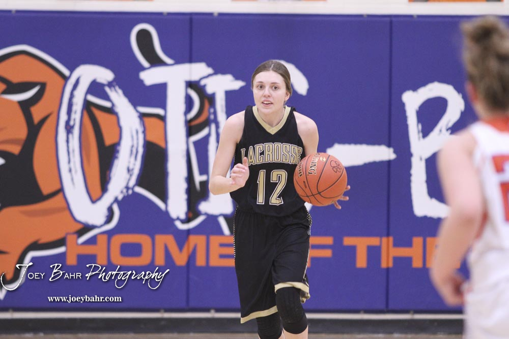 LaCrosse Lady Leopard #12 Bailey Baalmann brings the ball down the court. The Otis-Bison Lady Cougars defeated the LaCrosse Lady Leopards by a score of 43 to 19 in a game held at Otis-Bison High School in Otis, Kansas on February 17, 2020. (Photo: Joey Bahr, www.joeybahr.com)
