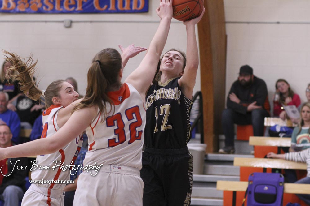 LaCrosse Lady Leopard #12 Bailey Baalmann looks to take a shot. The Otis-Bison Lady Cougars defeated the LaCrosse Lady Leopards by a score of 43 to 19 in a game held at Otis-Bison High School in Otis, Kansas on February 17, 2020. (Photo: Joey Bahr, www.joeybahr.com)