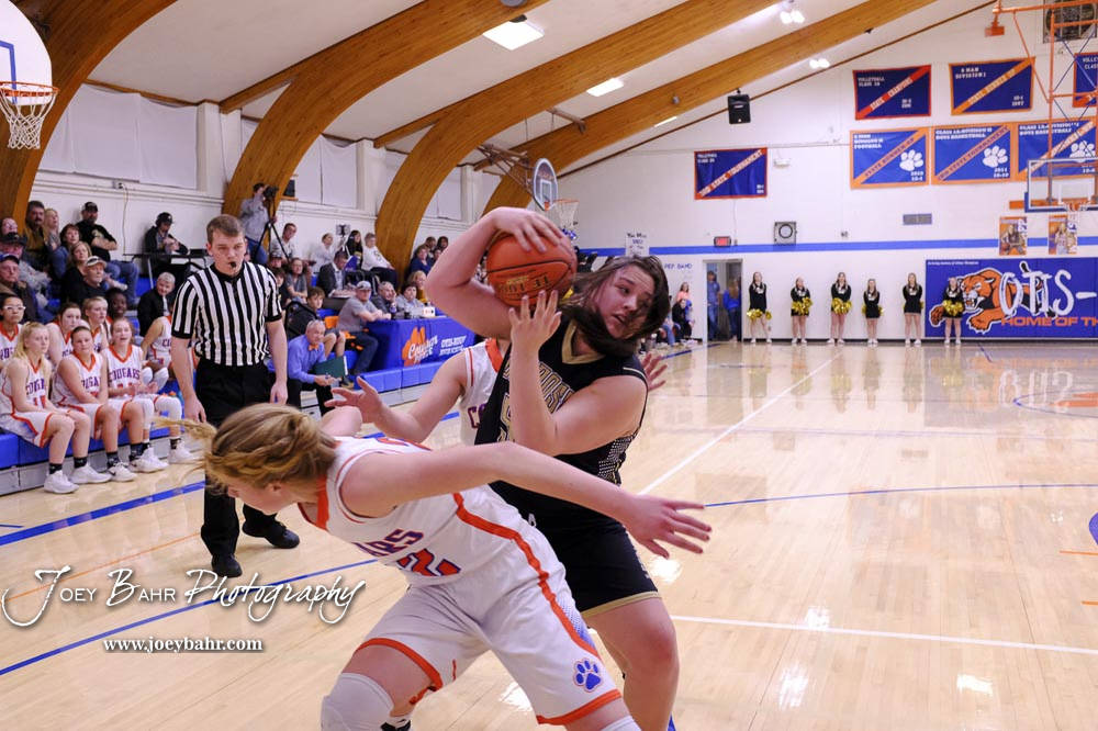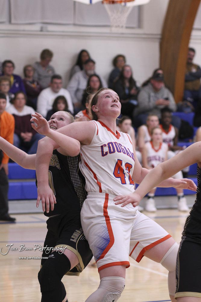 Otis-Bison Lady Cougar #42 Cora Anderson battles with LaCrosse Lady Leopard #40 Mckylie Lari for position under the basket. The Otis-Bison Lady Cougars defeated the LaCrosse Lady Leopards by a score of 43 to 19 in a game held at Otis-Bison High School in Otis, Kansas on February 17, 2020. (Photo: Joey Bahr, www.joeybahr.com)