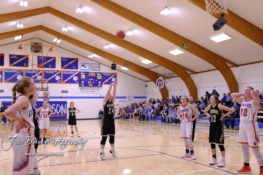 Otis-Bison Lady Cougar #24 Cristen Trapp shoots a free throw attempt. The Otis-Bison Lady Cougars defeated the LaCrosse Lady Leopards by a score of 43 to 19 in a game held at Otis-Bison High School in Otis, Kansas on February 17, 2020. (Photo: Joey Bahr, www.joeybahr.com)
