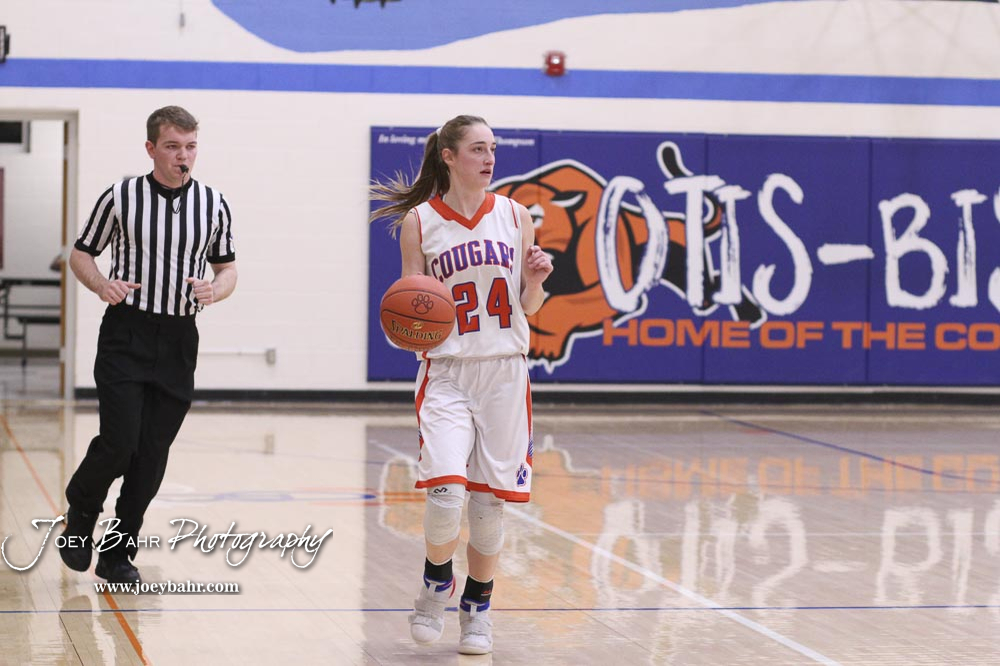 Otis-Bison Lady Cougar #24 Cristen Trapp brings the ball down the court. The Otis-Bison Lady Cougars defeated the LaCrosse Lady Leopards by a score of 43 to 19 in a game held at Otis-Bison High School in Otis, Kansas on February 17, 2020. (Photo: Joey Bahr, www.joeybahr.com)