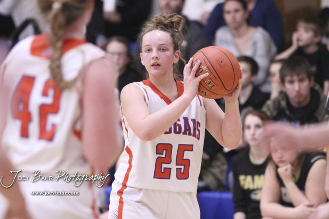 Otis-Bison Lady Cougar #25 Danica Bartonek looks for a teammate to pass the ball to. The Otis-Bison Lady Cougars defeated the LaCrosse Lady Leopards by a score of 43 to 19 in a game held at Otis-Bison High School in Otis, Kansas on February 17, 2020. (Photo: Joey Bahr, www.joeybahr.com)