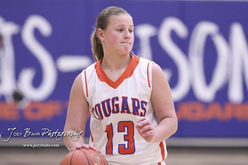 Otis-Bison Lady Cougar #13 Johannah Baalmann brings the ball down the court. The Otis-Bison Lady Cougars defeated the LaCrosse Lady Leopards by a score of 43 to 19 in a game held at Otis-Bison High School in Otis, Kansas on February 17, 2020. (Photo: Joey Bahr, www.joeybahr.com)