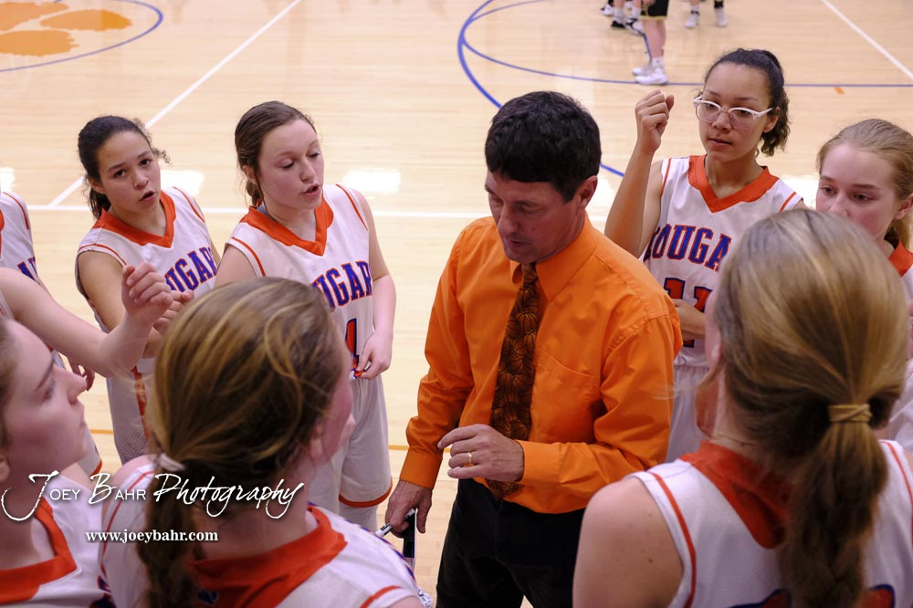 Otis-Bison Lady Cougar Head Coach Robert Trapp addresses his players during a timeout. The Otis-Bison Lady Cougars defeated the LaCrosse Lady Leopards by a score of 43 to 19 in a game held at Otis-Bison High School in Otis, Kansas on February 17, 2020. (Photo: Joey Bahr, www.joeybahr.com)