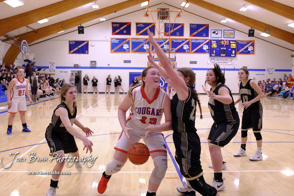 Otis-Bison Lady Cougar #42 Cora Anderson tries to go to the basket with the ball as LaCrosse Lady Leopard #24 Brooke Herrman defends. The Otis-Bison Lady Cougars defeated the LaCrosse Lady Leopards by a score of 43 to 19 in a game held at Otis-Bison High School in Otis, Kansas on February 17, 2020. (Photo: Joey Bahr, www.joeybahr.com)