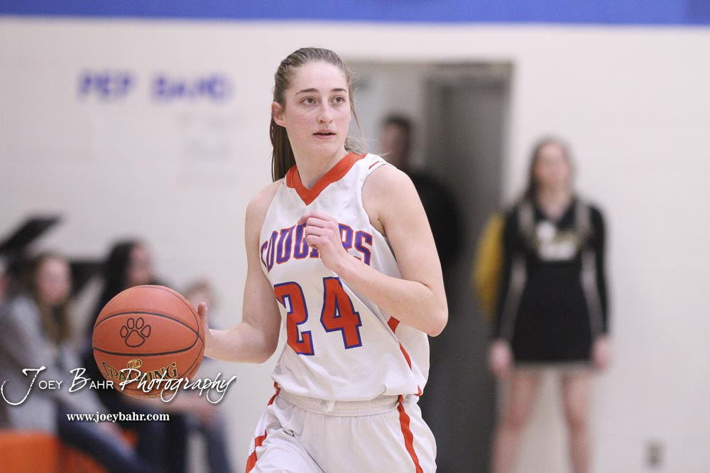 Otis-Bison Lady Cougar #24 Cristen Trapp looks for a player to pass the ball to. The Otis-Bison Lady Cougars defeated the LaCrosse Lady Leopards by a score of 43 to 19 in a game held at Otis-Bison High School in Otis, Kansas on February 17, 2020. (Photo: Joey Bahr, www.joeybahr.com)