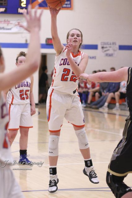 Otis-Bison Lady Cougar #22 Maddie Wiltse shoots a free throw attempt. The Otis-Bison Lady Cougars defeated the LaCrosse Lady Leopards by a score of 43 to 19 in a game held at Otis-Bison High School in Otis, Kansas on February 17, 2020. (Photo: Joey Bahr, www.joeybahr.com)