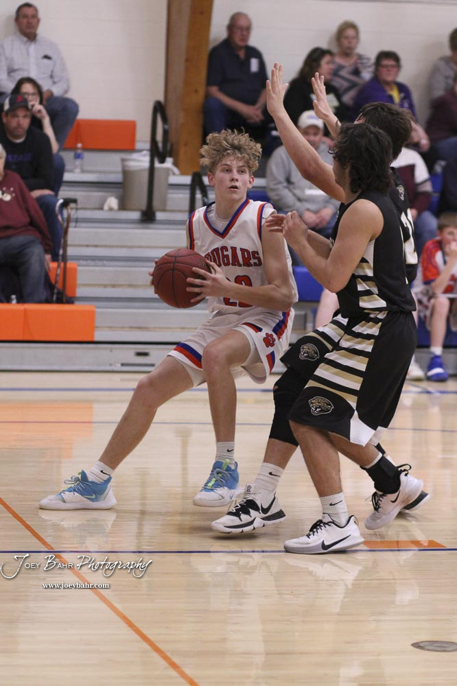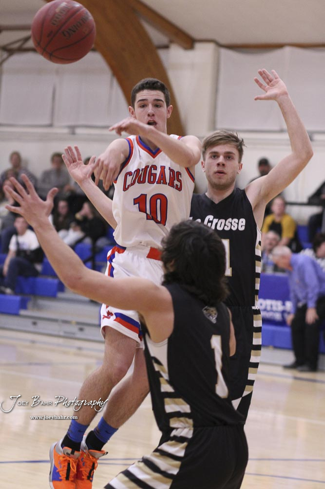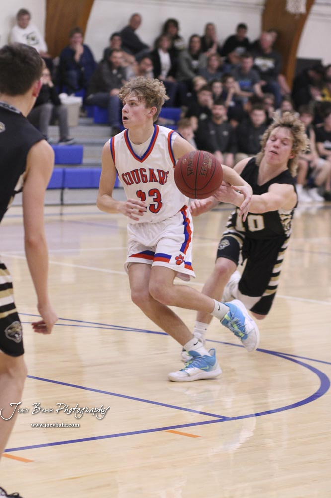 Otis-Bison Cougar #23 Dalton Regan looks for an open teammate. The LaCrosse Leoaprds defeated the Otis-Bison Cougars by a score of 68 to 31 in a matchup of Rush County schools at Otis-Bison High School in Otis, Kansas on February 17, 2020. (Photo: Joey Bahr, www.joeybahr.com)