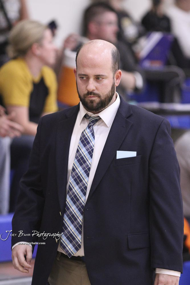 Otis-Bison Cougar Assistant Coach Curtis Little watches a play develop on the court. The LaCrosse Leoaprds defeated the Otis-Bison Cougars by a score of 68 to 31 in a matchup of Rush County schools at Otis-Bison High School in Otis, Kansas on February 17, 2020. (Photo: Joey Bahr, www.joeybahr.com)