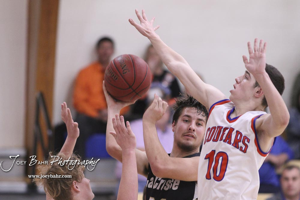 Otis-Bison Cougar #10 Jayce Kohls passes the ball as LaCrosse Leopards #11 Kaden Depperschmidt and #1 Hunter Morgan defend. The LaCrosse Leoaprds defeated the Otis-Bison Cougars by a score of 68 to 31 in a matchup of Rush County schools at Otis-Bison High School in Otis, Kansas on February 17, 2020. (Photo: Joey Bahr, www.joeybahr.com)