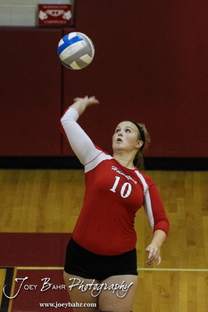 Hoisington Lady Cardinal McKenzie Moore (#10) serves the ball during the Hoisington Lady Cardinals versus Larned Lady Indians volleyball match with Hoisington winning 25-20 and 25-10 at Hoisington Activity Center in Hoisington, Kansas on September 9, 2014. (Photo: Joey Bahr, www.joeybahr.com)