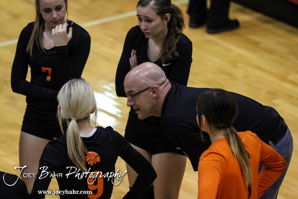 Larned Lady Indian Head Coach Paul Deveaux talks to his players during the Hoisington Lady Cardinals versus Larned Lady Indians volleyball match with Hoisington winning 25-20 and 25-10 at Hoisington Activity Center in Hoisington, Kansas on September 9, 2014. (Photo: Joey Bahr, www.joeybahr.com)
