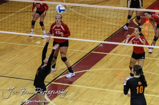 during the Hoisington Lady Cardinals versus Larned Lady Indians volleyball match with Hoisington winning 25-20 and 25-10