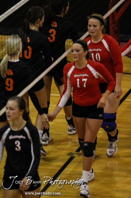 Members of the Larned Lady Indians and Hoisington Lady Cardinals shake hands after the Hoisington Lady Cardinals versus Larned Lady Indians volleyball match with Hoisington winning 25-20 and 25-10 at Hoisington Activity Center in Hoisington, Kansas on September 9, 2014. (Photo: Joey Bahr, www.joeybahr.com)