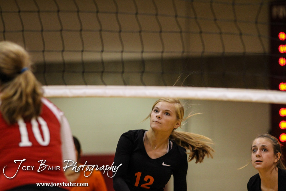 Larned Lady Indian Allyson Aldrich (#12) watches the ball go over the net during the Hoisington Lady Cardinals versus Larned Lady Indians volleyball match with Hoisington winning 25-20 and 25-10 at Hoisington Activity Center in Hoisington, Kansas on September 9, 2014. (Photo: Joey Bahr, www.joeybahr.com)