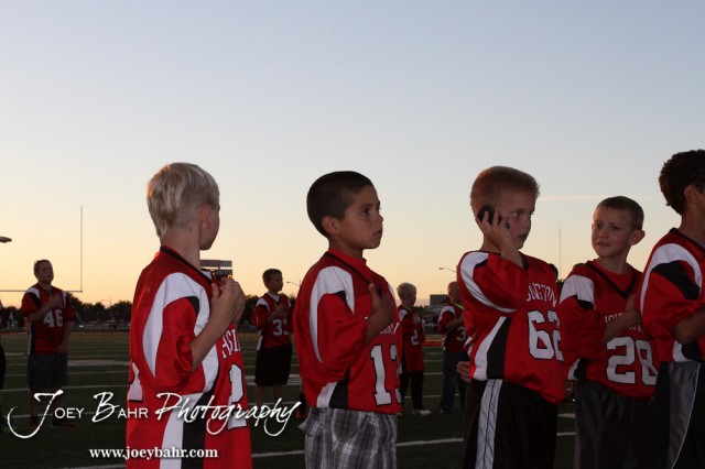 Young Hoisington Cardinal fans salute the flag during the National Anthem before the Larned at Hoisington High School Football game with Hoisington winning 27 to 9 at Elton Brown Field in Hoisington, Kansas on October 11, 2013. (Photo: Joey Bahr, www.joeybahr.com)