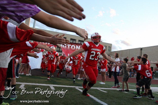Hoisington Cardinal Avery Urban (#23) runs out onto the field prior to the Larned at Hoisington High School Football game with Hoisington winning 27 to 9 at Elton Brown Field in Hoisington, Kansas on October 11, 2013. (Photo: Joey Bahr, www.joeybahr.com)