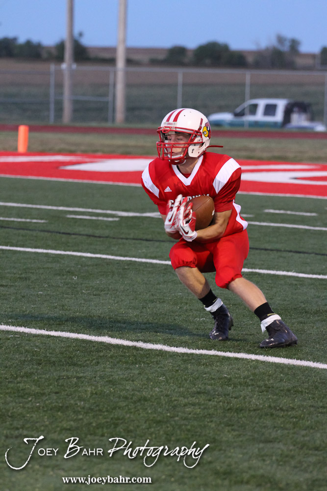 Hoisington Cardinal Brandon Ball (#9) receives a punt during the Larned at Hoisington High School Football game with Hoisington winning 27 to 9 at Elton Brown Field in Hoisington, Kansas on October 11, 2013. (Photo: Joey Bahr, www.joeybahr.com)