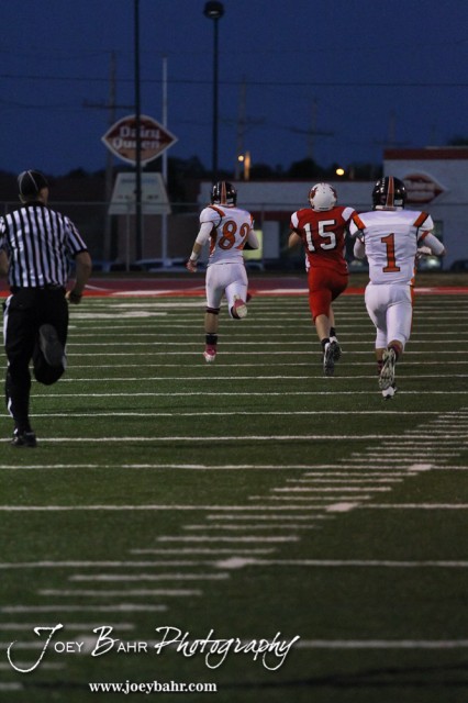 Larned Indian Tyler Stelter (#82) runs back a blocked field goal attempt for a touchdown during the Larned at Hoisington High School Football game with Hoisington winning 27 to 9 at Elton Brown Field in Hoisington, Kansas on October 11, 2013. (Photo: Joey Bahr, www.joeybahr.com)