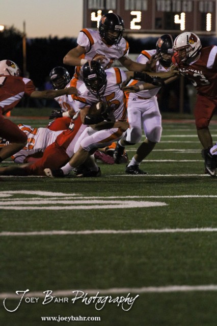A group of Hoisington Cardinals tackle Larned Indian Landon Erway (#45) during the Larned at Hoisington High School Football game with Hoisington winning 27 to 9 at Elton Brown Field in Hoisington, Kansas on October 11, 2013. (Photo: Joey Bahr, www.joeybahr.com)