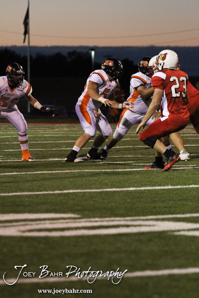 Larned Indian Ty O’Neil (#55) looks for a Hoisington Cardinal to block during the Larned at Hoisington High School Football game with Hoisington winning 27 to 9 at Elton Brown Field in Hoisington, Kansas on October 11, 2013. (Photo: Joey Bahr, www.joeybahr.com)