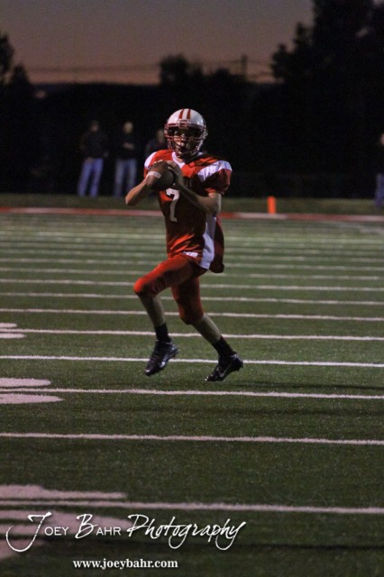 Hoisington Cardinal Taylor Richter (#7) looks for a receiver to throw to during the Larned at Hoisington High School Football game with Hoisington winning 27 to 9 at Elton Brown Field in Hoisington, Kansas on October 11, 2013. (Photo: Joey Bahr, www.joeybahr.com)