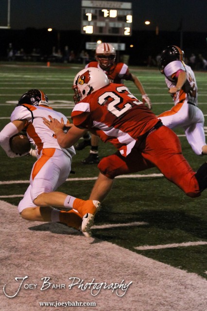 Hoisington Cardinal Avery Urban (#23) pushes Larned Indian Gage Stude (#2) out of bounds during the Larned at Hoisington High School Football game with Hoisington winning 27 to 9 at Elton Brown Field in Hoisington, Kansas on October 11, 2013. (Photo: Joey Bahr, www.joeybahr.com)