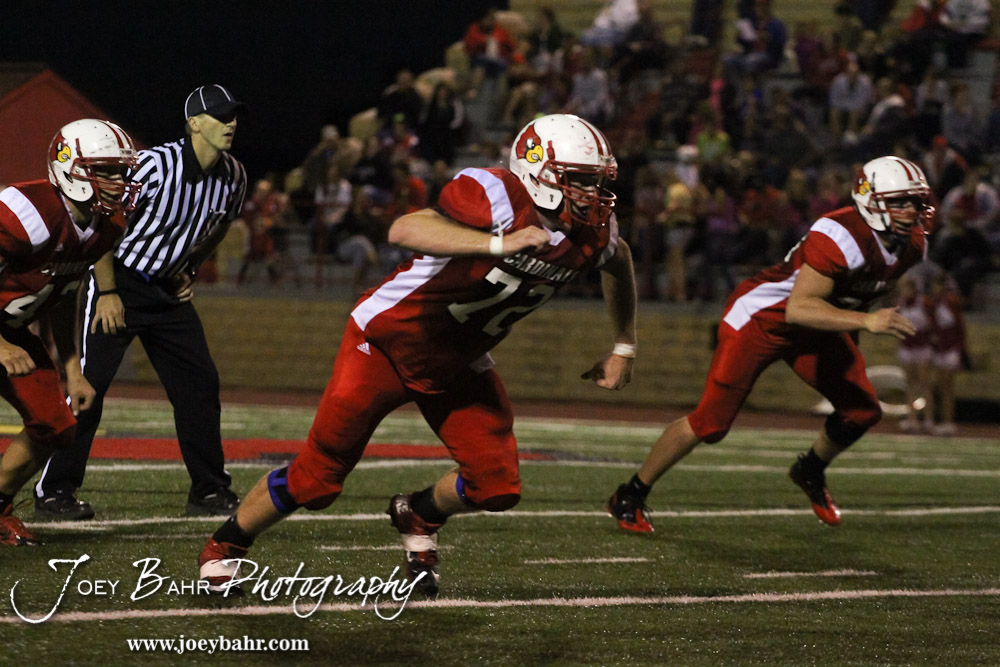 Larned Indian Jordan Kramer (#72) launches to face the Larned Indian Offensive Line during the Larned at Hoisington High School Football game with Hoisington winning 27 to 9 at Elton Brown Field in Hoisington, Kansas on October 11, 2013. (Photo: Joey Bahr, www.joeybahr.com)