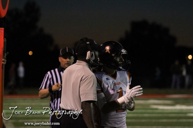 Larned Indian Head Coach AB Stokes gives the next play to Evan Skelton (#1) during the Larned at Hoisington High School Football game with Hoisington winning 27 to 9 at Elton Brown Field in Hoisington, Kansas on October 11, 2013. (Photo: Joey Bahr, www.joeybahr.com)