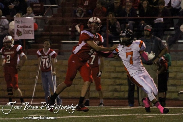 Hoisington Cardinal Steffan Dolechek (#4) blocks Larned Indian Jamil Shoemaker (#7) during the Larned at Hoisington High School Football game with Hoisington winning 27 to 9 at Elton Brown Field in Hoisington, Kansas on October 11, 2013. (Photo: Joey Bahr, www.joeybahr.com)