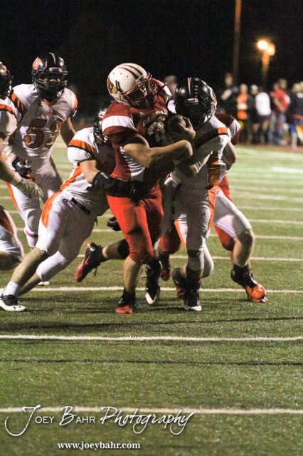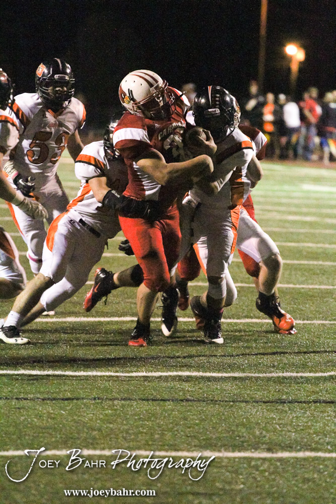 Hoisington Cardinal Avery Urban (#23) fights through a Larned Indian tackle during the Larned at Hoisington High School Football game with Hoisington winning 27 to 9 at Elton Brown Field in Hoisington, Kansas on October 11, 2013. (Photo: Joey Bahr, www.joeybahr.com)