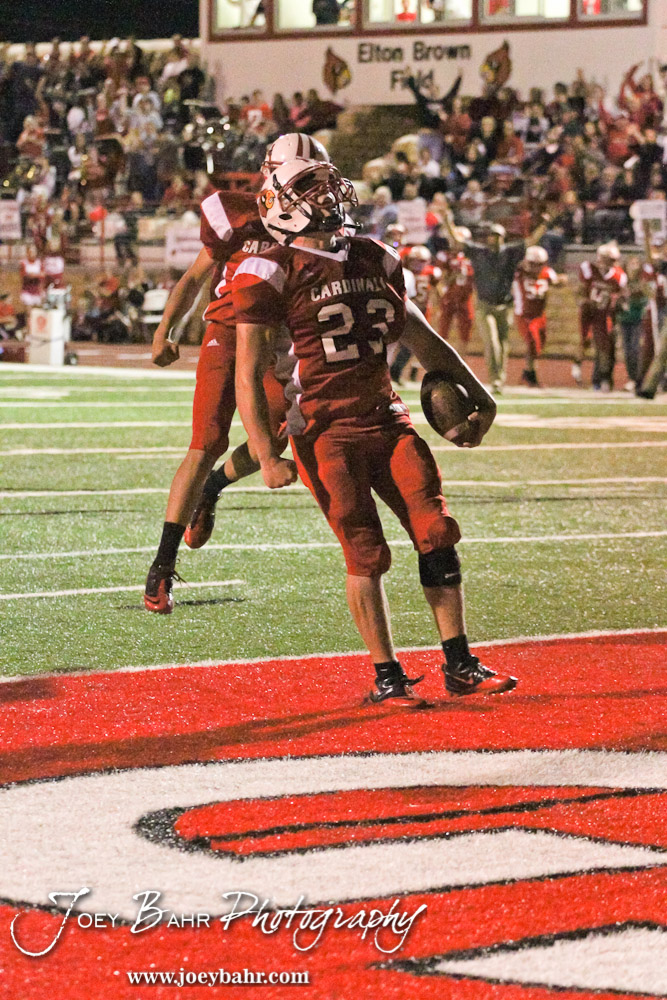 Hoisington Cardinal Avery Urban (#23) celebrates scoring a touchdown during the Larned at Hoisington High School Football game with Hoisington winning 27 to 9 at Elton Brown Field in Hoisington, Kansas on October 11, 2013. (Photo: Joey Bahr, www.joeybahr.com)
