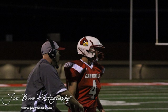 Hoisington Cardinal Head Coach Jason Ingram gives the next play to Steffan Dolechek (#4) during the Larned at Hoisington High School Football game with Hoisington winning 27 to 9 at Elton Brown Field in Hoisington, Kansas on October 11, 2013. (Photo: Joey Bahr, www.joeybahr.com)