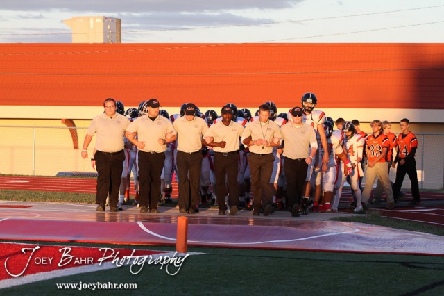Larned Indian coaches lead their players onto the field before the Larned at Hoisington High School Football game with Hoisington winning 27 to 9 at Elton Brown Field in Hoisington, Kansas on October 11, 2013. (Photo: Joey Bahr, www.joeybahr.com)
