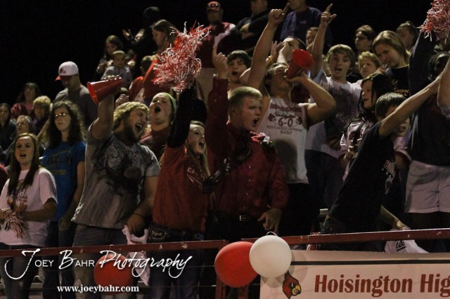Hoisington Cardinal fans cheer the first down during the Larned at Hoisington High School Football game with Hoisington winning 27 to 9 at Elton Brown Field in Hoisington, Kansas on October 11, 2013. (Photo: Joey Bahr, www.joeybahr.com)