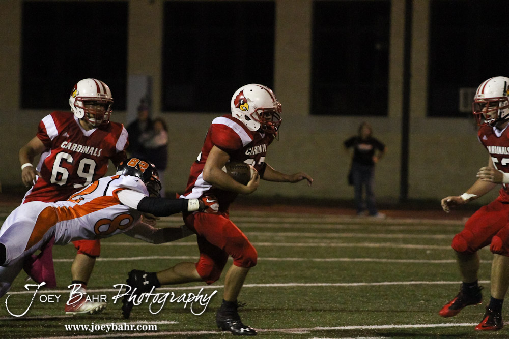 Larned Indian Tyler Stelter (#82) reaches to tackle Hoisington Cardinal Nolan McCurry (#22) during the Larned at Hoisington High School Football game with Hoisington winning 27 to 9 at Elton Brown Field in Hoisington, Kansas on October 11, 2013. (Photo: Joey Bahr, www.joeybahr.com)