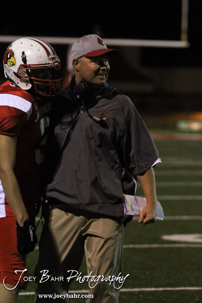 Hoisington Cardinal Head Coach Jason Ingram flashes a smile while talking to a player during the Larned at Hoisington High School Football game with Hoisington winning 27 to 9 at Elton Brown Field in Hoisington, Kansas on October 11, 2013. (Photo: Joey Bahr, www.joeybahr.com)