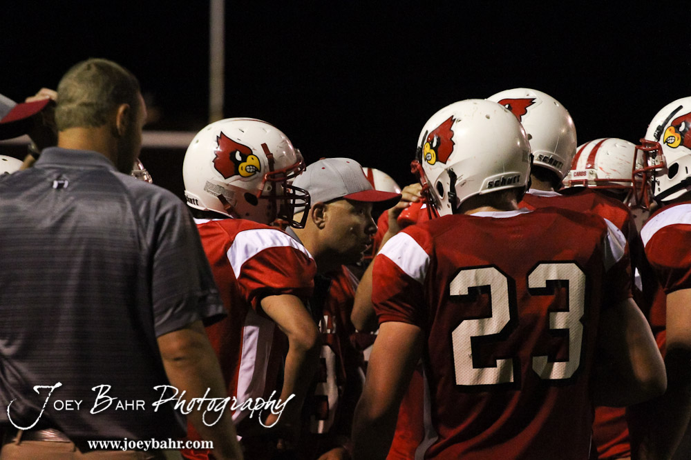 Hoisington Cardinal Head Coach Jason Ingram talks to his players during a time out during the Larned at Hoisington High School Football game with Hoisington winning 27 to 9 at Elton Brown Field in Hoisington, Kansas on October 11, 2013. (Photo: Joey Bahr, www.joeybahr.com)