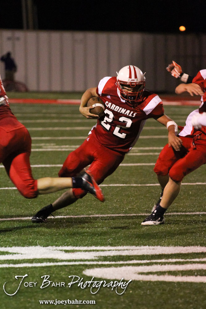 Hoisington Cardinal Nolan McCurry (#22) cuts up with the ball during the Larned at Hoisington High School Football game with Hoisington winning 27 to 9 at Elton Brown Field in Hoisington, Kansas on October 11, 2013. (Photo: Joey Bahr, www.joeybahr.com)