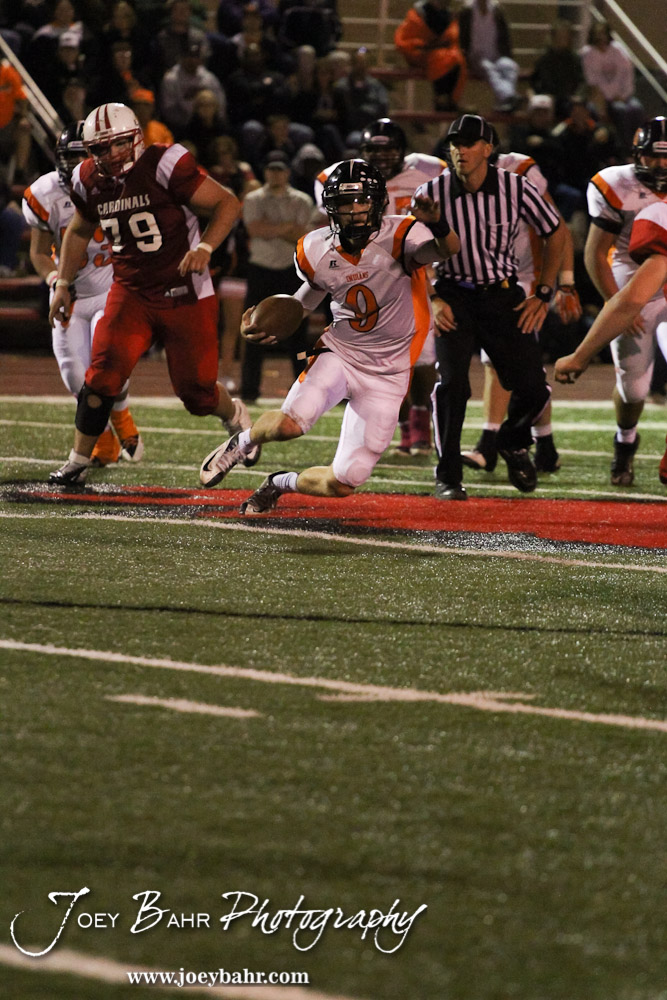 Larned Indian Easton Palmer (#9) scrambles wit the ball during the Larned at Hoisington High School Football game with Hoisington winning 27 to 9 at Elton Brown Field in Hoisington, Kansas on October 11, 2013. (Photo: Joey Bahr, www.joeybahr.com)