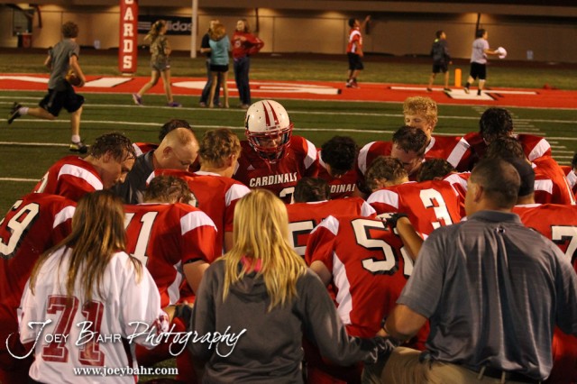 The Hoisington Cardinals pray after the Larned at Hoisington High School Football game with Hoisington winning 27 to 9 at Elton Brown Field in Hoisington, Kansas on October 11, 2013. (Photo: Joey Bahr, www.joeybahr.com)