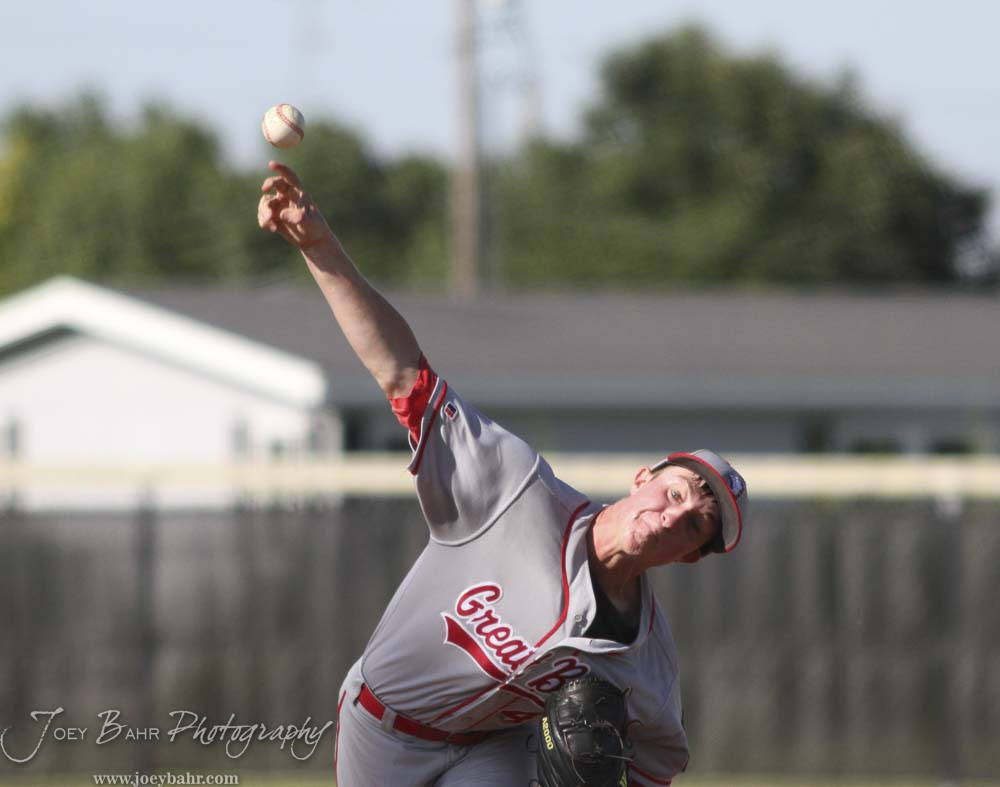 Great Bend Chief Brad Reif (#42) throws a pitch in the top of the First Inning. The Great Bend Chiefs win game 1 of a American Legion baseball double header over the Larned Indians 7 to 6 after 8 innings at the Great Bend Sports Complex in Great Bend, Kansas on June 29, 2016. (Photo: Joey Bahr, www.joeybahr.com)undefined