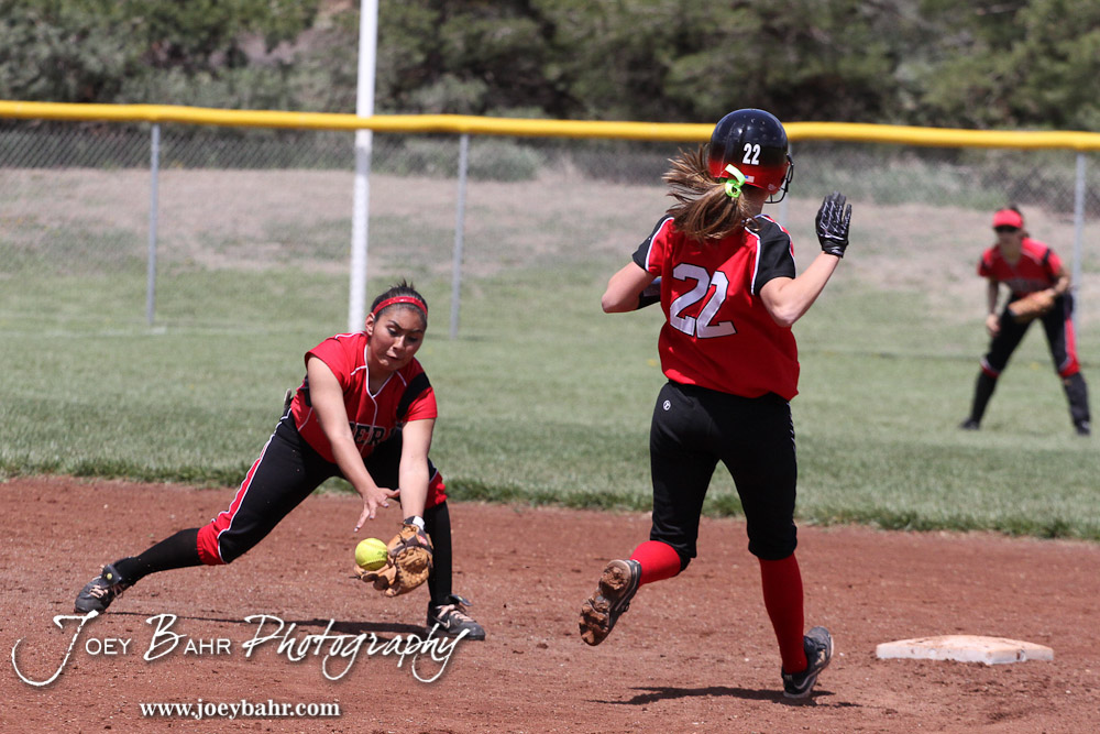 Great Bend Lady Panther McKenna Mauler (#22) runs to second as Liberal Lady Redskin Cynthia Cisneros (#5) fields the ball during the Liberal Lady Redskins at Great Bend Lady Panthers Softball Double Header with Great Bend winning both games 18-0 (3 innings) 13-0 at Barton Community College Softball Field in Great Bend, Kansas on April 27, 2013. (Photo: Joey Bahr, www.joeybahr.com)